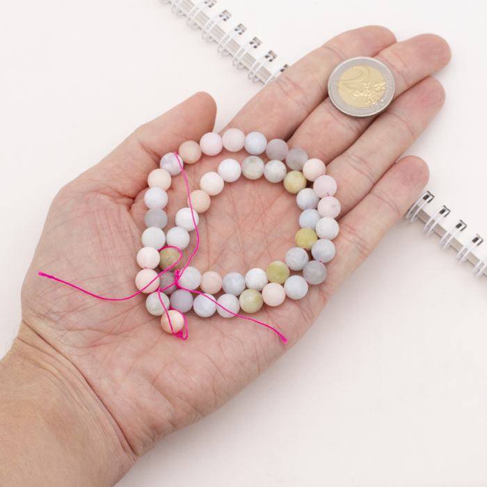 Koraliki Naturalny Morganit, Matowy Styl, Okrągłe, Termobarwione Kraj pochodzenia kamienia to Afryka. Kolor: Mieszane kolory, Rozmiar: średnica 8-9mm, Otwór: 1mm, około 45szt / 40cm / sznur Naturalne koraliki z morganitu to doskonały wybór do tworzenia delikatnej i eleganckiej biżuterii. Morganit ma delikatny różowy odcień, który nadaje elementom wyrafinowany i kobiecy wygląd. Koraliki te są idealne do tworzenia bransoletek, naszyjników, kolczyków i innej biżuterii. Będą wyglądać świetnie zarówno w codziennych stylizacjach, jak i podczas specjalnych wydarzeń, nadając stylizacji niepowtarzalnego uroku i blasku. Stwórz wyjątkową biżuterię z naturalnymi koralikami morganitowymi i podkreśl swoją indywidualność oraz wyszukany gust. Obraz może wyglądać inaczej (kolor) ze względu na różne odwzorowanie kolorów przez monitory. Termiczno barwienie kamieni to procedura, w której ogrzewanie zmienia kolor kamieni naturalnych, aby uzyskać bogatszy i bardziej pożądany efekt kolorystyczny, czyniąc je bardziej atrakcyjnymi i poprawiając ich wygląd.