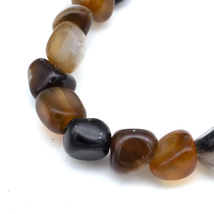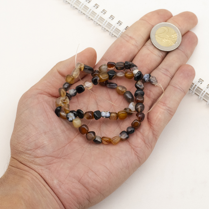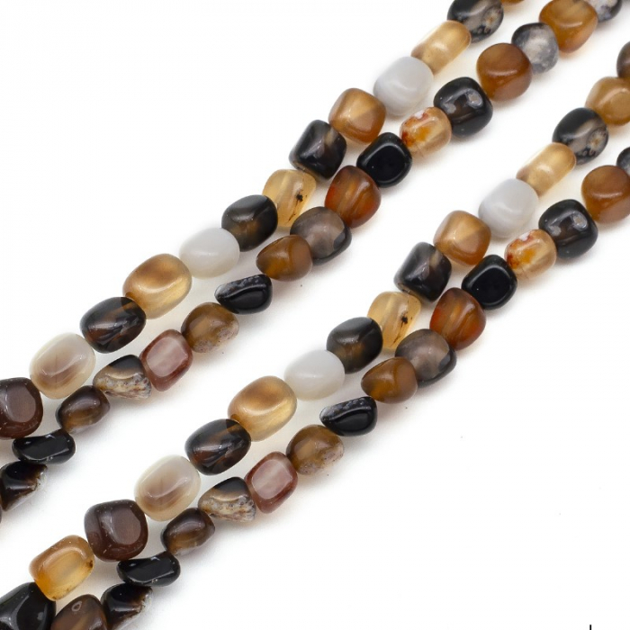 Koraliki Czarny Agat, Termobarwione, Bryłki, na nici, Kraj pochodzenia kamienia to Brazylia Rozmiar: Długość: 5-7mm, szerokość: 5-7mm, otwór 1mm około 38cm / nić Właściwości energetyczne agatu: Uważa się, że agat promuje stabilność, równowagę i przejrzystość we wszystkich dziedzinach życia. Jego energetyczne właściwości równoważące pomagają regulować przepływ energii w ciele, promując ogólne zdrowie i dobre samopoczucie. Jest często używany w medytacji i innych praktykach duchowych, ponieważ pomaga uspokoić umysł i promuje wewnętrzny spokój. Uważa się również, że zwiększa odwagę noszącego, poprawia percepcję i koncentrację oraz chroni przed niebezpieczeństwem. Termobarwienie kamieni - to procedura, podczas której ogrzewanie zmienia kolor naturalnych kamieni w celu uzyskania bardziej intensywnego i pożądanego efektu kolorystycznego, co sprawia, że stają się one bardziej atrakcyjne i poprawia ich wygląd