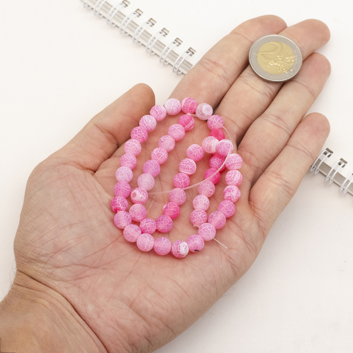 Koraliki Kamień Naturalny Agat Spękany Okrągły, Termobarwione, Matowy Styl, Kolor: Jasnoróżowy, Kraj Pochodzenia Kamienia: Brazylia. Rozmiar: Średnica: 8mm, otwór 1,2mm około 43szt / 34cm / sznur Uważa się, że agat promuje stabilność, równowagę i przejrzystość we wszystkich dziedzinach życia. Jego energetyczne właściwości równoważące pomagają regulować przepływ energii w ciele, promując ogólne zdrowie i dobre samopoczucie. Jest często używany w medytacji i innych praktykach duchowych, ponieważ pomaga uspokoić umysł i promuje wewnętrzny spokój. Uważa się również, że zwiększa odwagę noszącego, poprawia percepcję i koncentrację oraz chroni przed niebezpieczeństwem. W biżuterii koraliki te mogą być używane do tworzenia naszyjników, bransoletek, kolczyków, aby stworzyć unikalną ozdobę, która podkreśli Twój styl. Obraz może wyglądać inaczej (kolor) ze względu na różne odwzorowanie kolorów monitorów. Termobarwienie kamieni - to procedura, podczas której ogrzewanie zmienia kolor naturalnych kamieni w celu uzyskania bardziej intensywnego i pożądanego efektu kolorystycznego, co sprawia, że stają się one bardziej atrakcyjne i poprawia ich wygląd