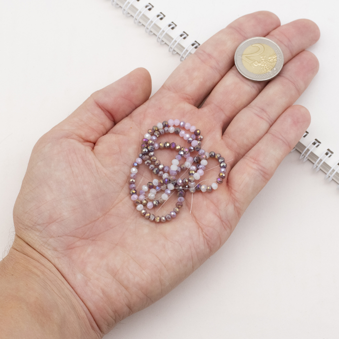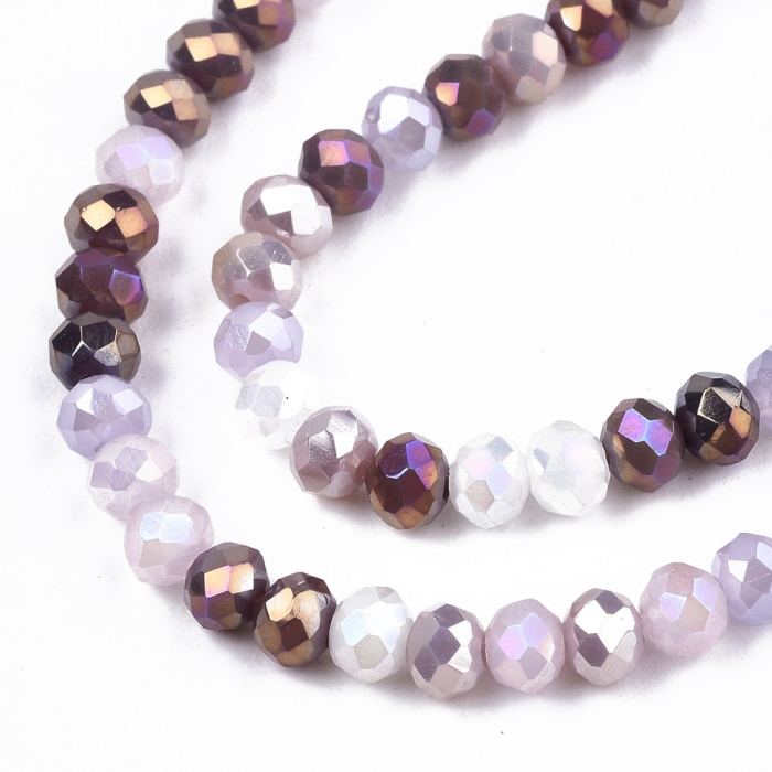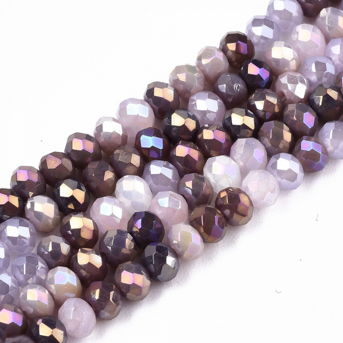 Koraliki Szklane Nieprzejrzysty Tęczowy, AB Powłoka, Fasetowane, Rondel, Kolor: Fioletowy, Rozmiar: Średnica 3,5mm, grubość 3mm, otwór 0,8mm około 140szt / 40cm / nić Te koraliki z powłoką benzynową lub opalizującą mają charakterystyczny kolorowy połysk na powierzchni. Bardzo często takie koraliki są oznaczane jako "AB" (od łacińskiego Aurora Borealis, co oznacza " aurora polarna"). Powłoka w kolorze AB (Aurora Borealis) to specjalna wielowarstwowa powłoka, która tworzy mieniący się i opalizujący efekt na powierzchni koralików, które mienią się w słońcu wszystkimi kolorami tęczy. W procesie fasetowania szklanych koralików wykorzystywane są unikalne technologie. W rezultacie koraliki są wielokolorowe i wielowymiarowe. Koraliki szklane mogą być wykorzystywane do tworzenia broszek, wisiorków, bransoletek, naszyjników, spinek do włosów i innej biżuterii, a także do ozdabiania ubrań, butów, kapeluszy, torebek itp