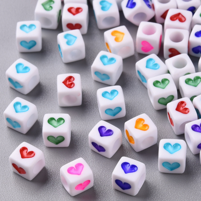 Koraliki Akrylowe Nieprzezroczyste Kostki z Sercem, Kolor: Mix, 6.5x6x6mm, Otwór 3mm, około 150szt / 25g (13WB30757)