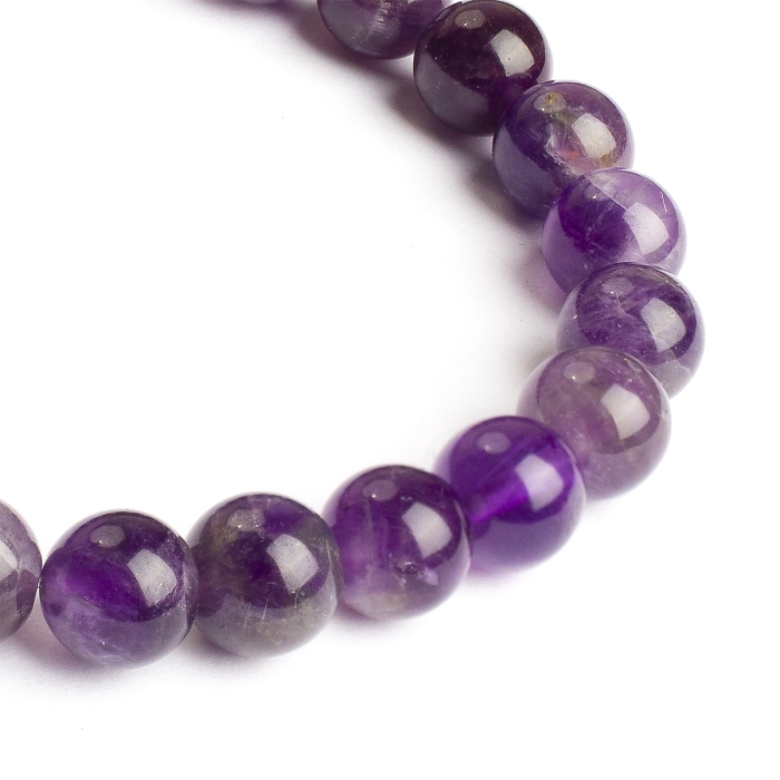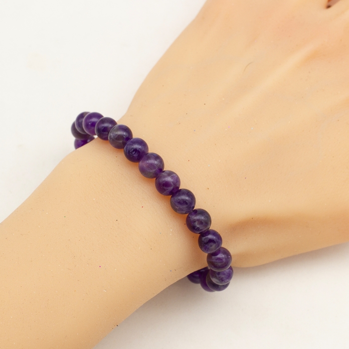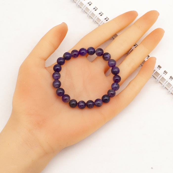 Ta bransoletka z naturalnych ametystowych koralików ma elegancki wygląd z okrągłymi koralikami w głębokich odcieniach fioletu. Każdy koralik posiada naturalną fakturę i opalizację, co czyni biżuterię niepowtarzalną. Bransoletka jest mocowana za pomocą elastycznej nici, co zapewnia wygodę noszenia i wszechstronność rozmiarów.