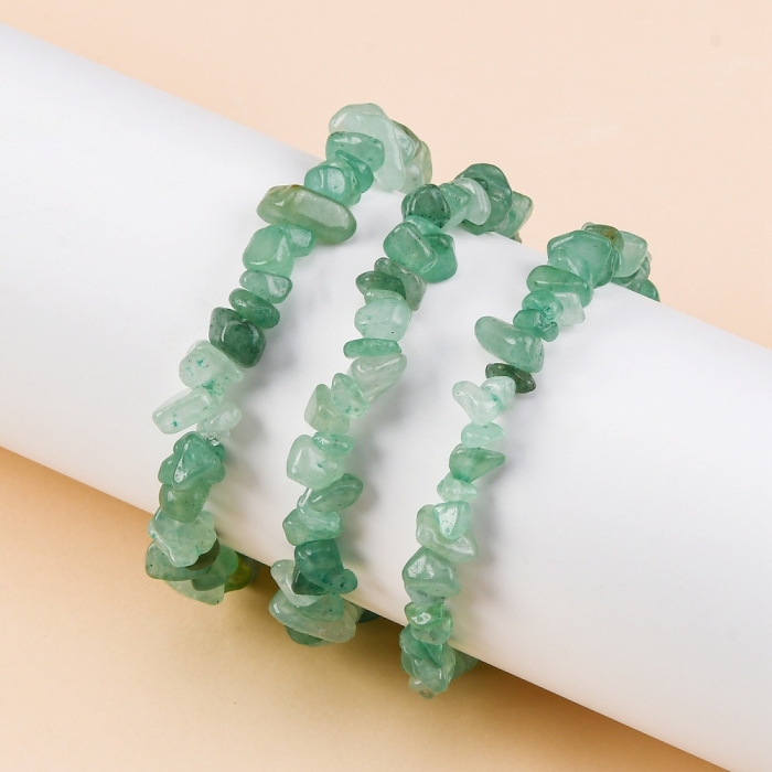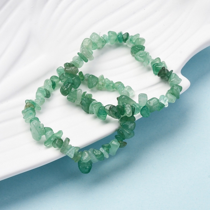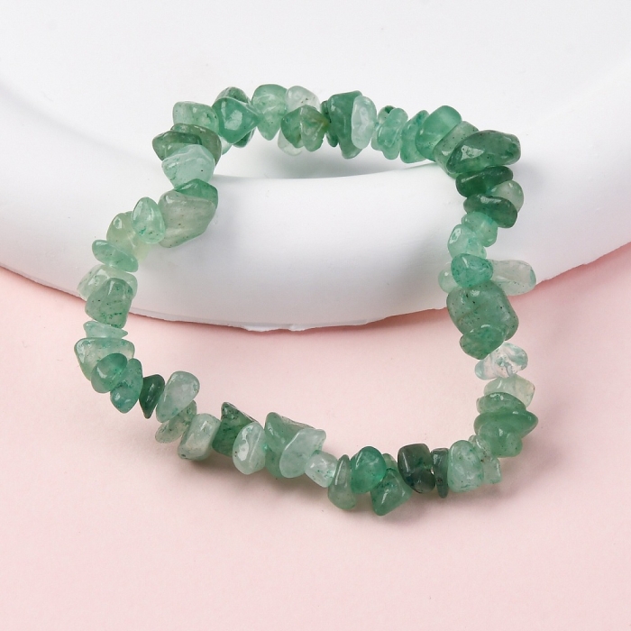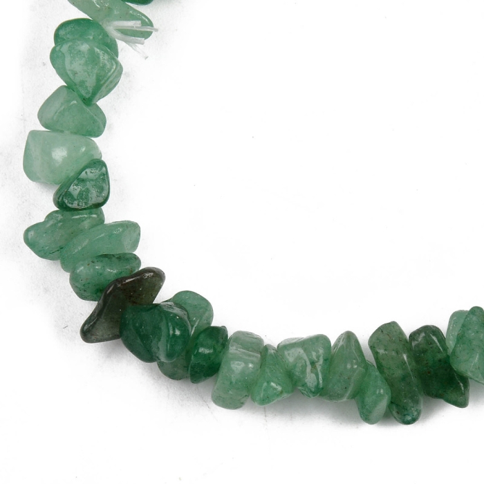Bransoletka unisex z naturalnego zielonego awenturynu, wykonana z małych, nierównych koralików (chip beads) nawleczonych na elastyczną nić. Dzięki naturalnemu kształtowi kamieni każda bransoletka ma niepowtarzalny wygląd.