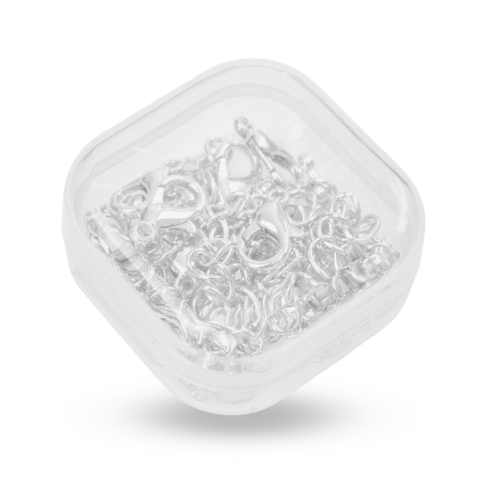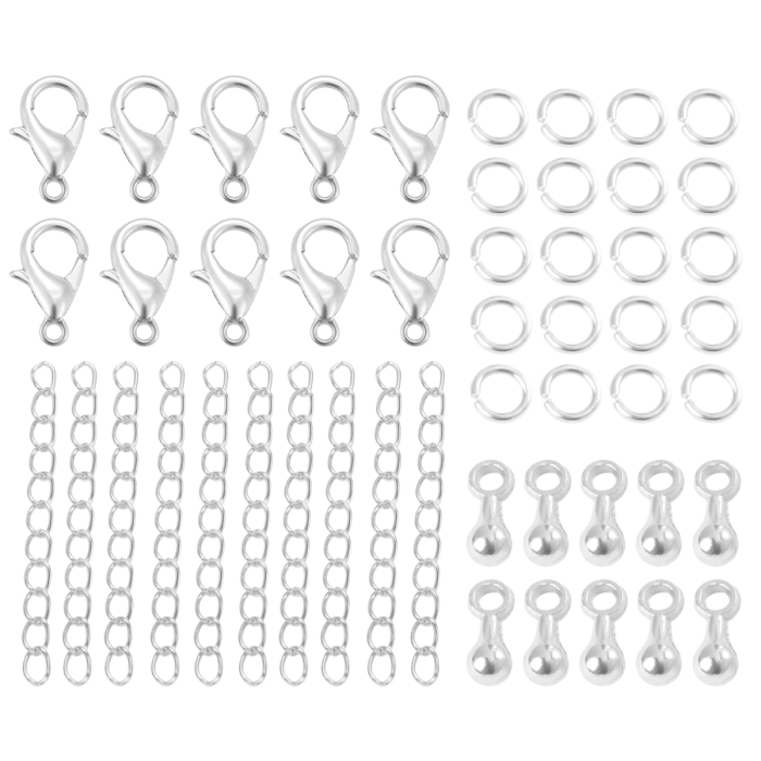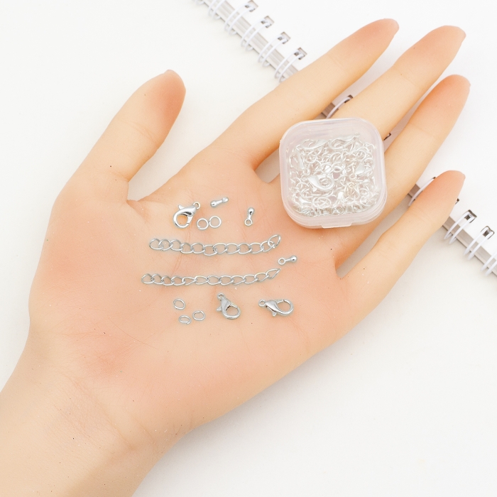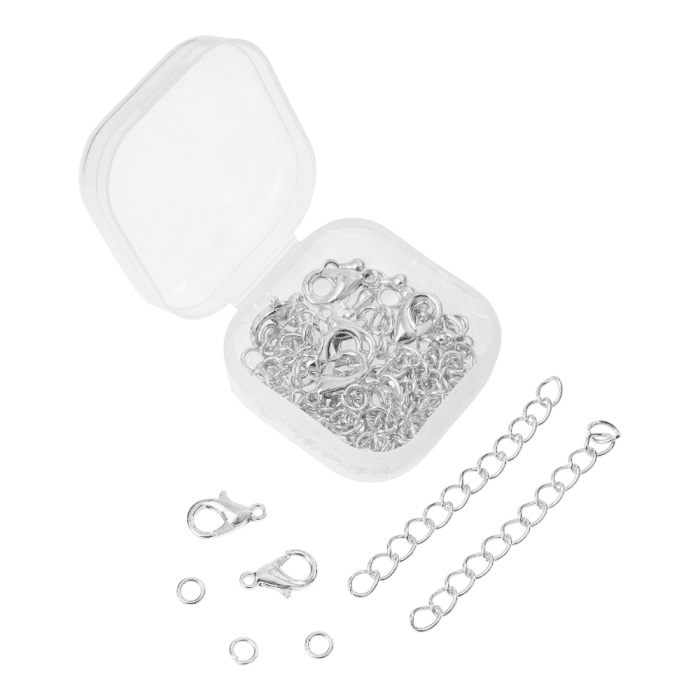Zestaw zawiera podstawowe elementy do tworzenia i naprawy biżuterii. Wszystkie części wykonane są z trwałych materiałów — stopu cynku i żelaza, co zapewnia wytrzymałość i niezawodność. Powłoka w kolorze srebrny nadaje elegancki wygląd, a praktyczny pojemnik ułatwia przechowywanie i organizację.