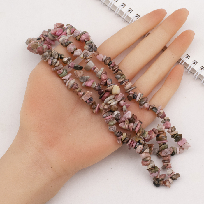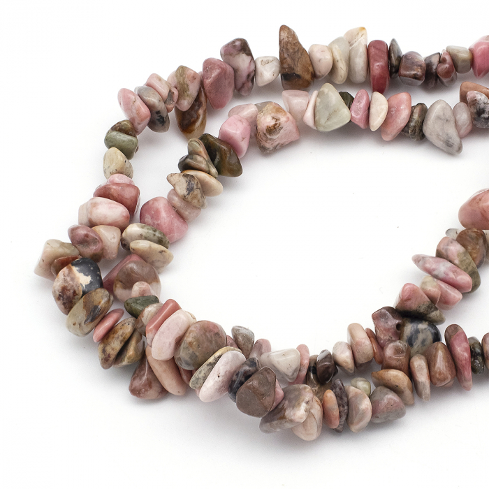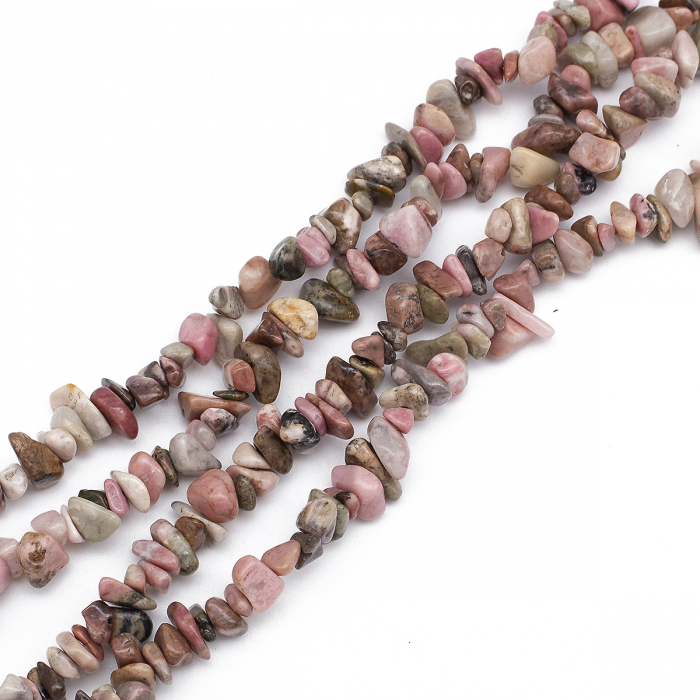 Koraliki wykonane są z naturalnego rodonitu w formie okruchów. Rodonit znany jest z bogatych odcieni różu i brązu, które tworzą niepowtarzalne i wyraziste wzory. Niebarwione koraliki zachowują naturalną fakturę i kolor kamienia, dzięki czemu idealnie nadają się do tworzenia biżuterii o naturalnej i ziemistej estetyce. Rodonit jest uważany za kamień miłości, wewnętrznego uzdrowienia i równowagi emocjonalnej. Pomaga zrównoważyć emocje, wzmacnia wewnętrzną harmonię i pomaga przywrócić spokój ducha. Rodonit pomaga również radzić sobie z traumą emocjonalną i stresem, wnosząc poczucie spokoju i pewności w życie swojego właściciela.