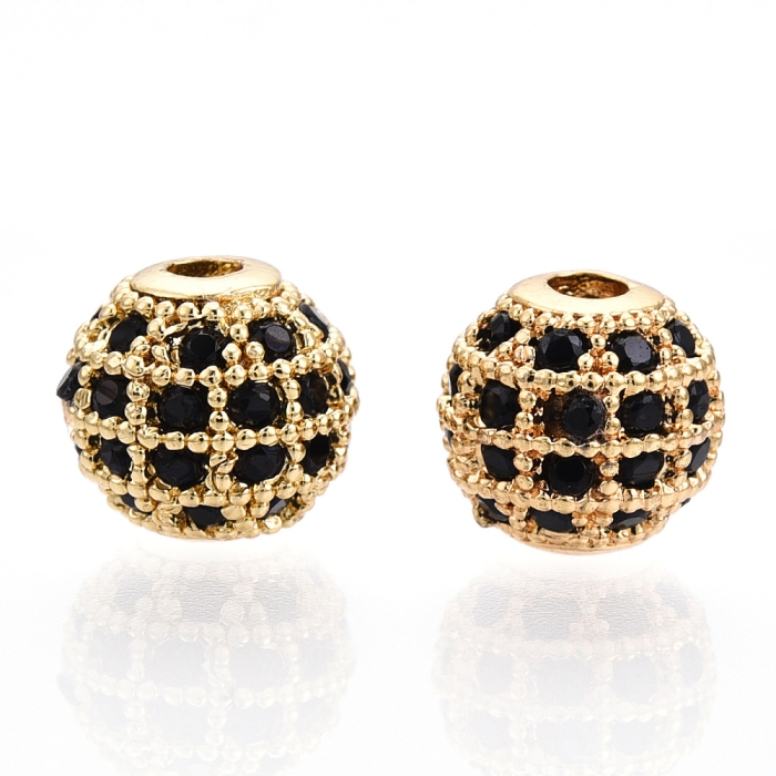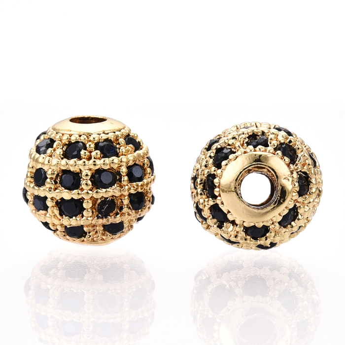 Намистини Латунь з Фіанітами, Круглі, Стійке Покриття, Золото/Чорний, 8х7мм, Отвір 2мм, (13WB32485)