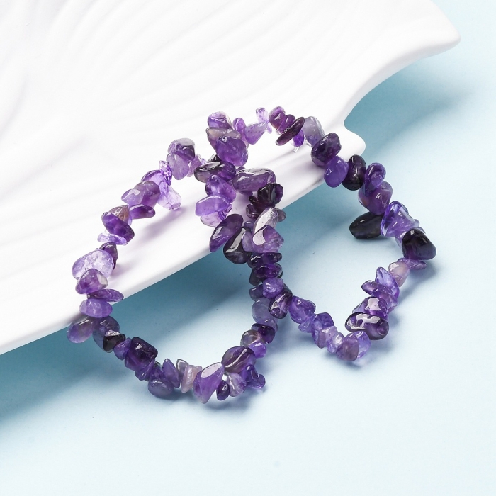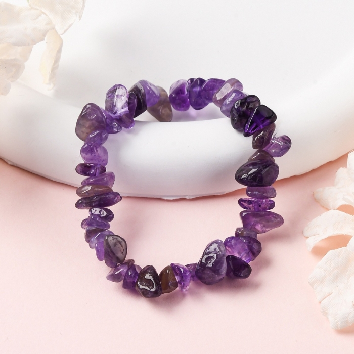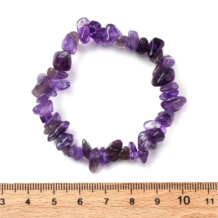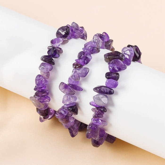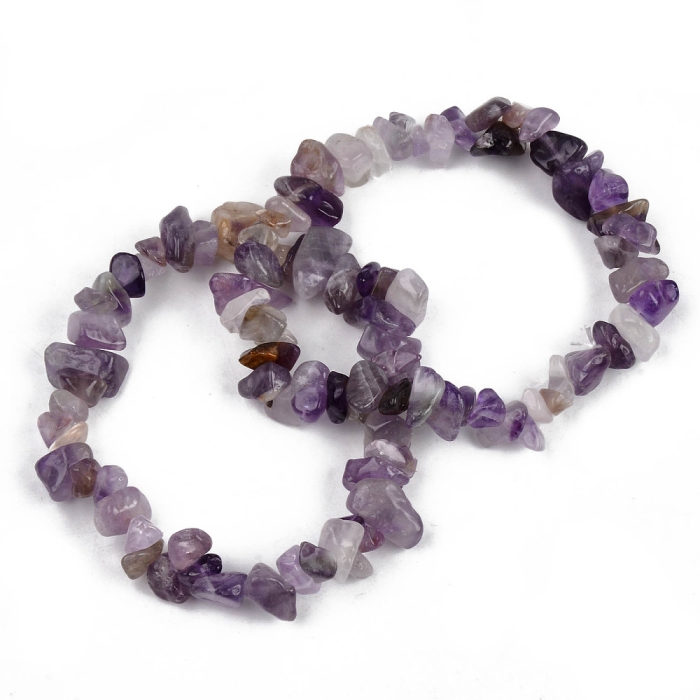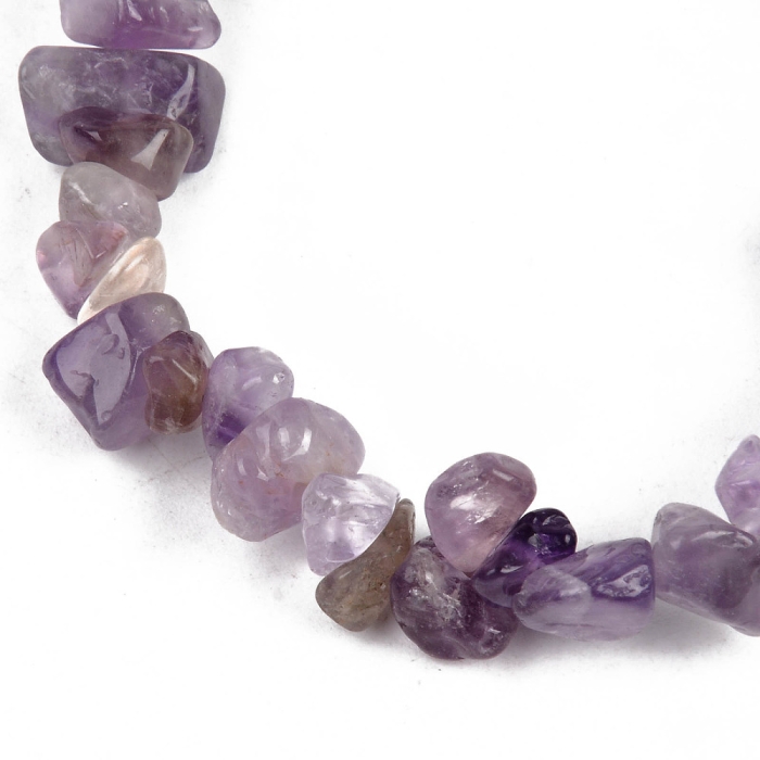 Браслет унісекс з натурального аметисту у вигляді камінців неправильної форми (сколів), нанизаних на міцну гумку. Кожен виріб унікальний завдяки природній формі та відтінкам каменів - від світло-бузкового до насиченого фіолетового.