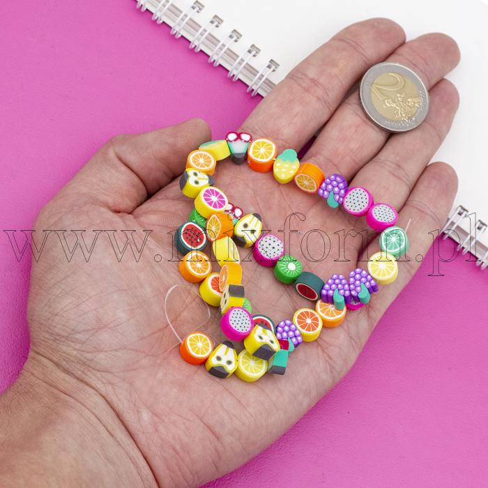 Ці намистини виготовлені вручну з полімерної глини, легкого та міцного матеріалу, який дозволяє створювати яскраві й деталізовані дизайни. Намистини представлені у вигляді різноманітних фруктів, таких як лимони, полуниця, апельсини та інші, що робить їх незвичайними і привабливими елементами для прикрас. Полімерна глина відзначається високою пластичністю та стійкістю до впливу зовнішніх факторів, що забезпечує довговічність виробів.