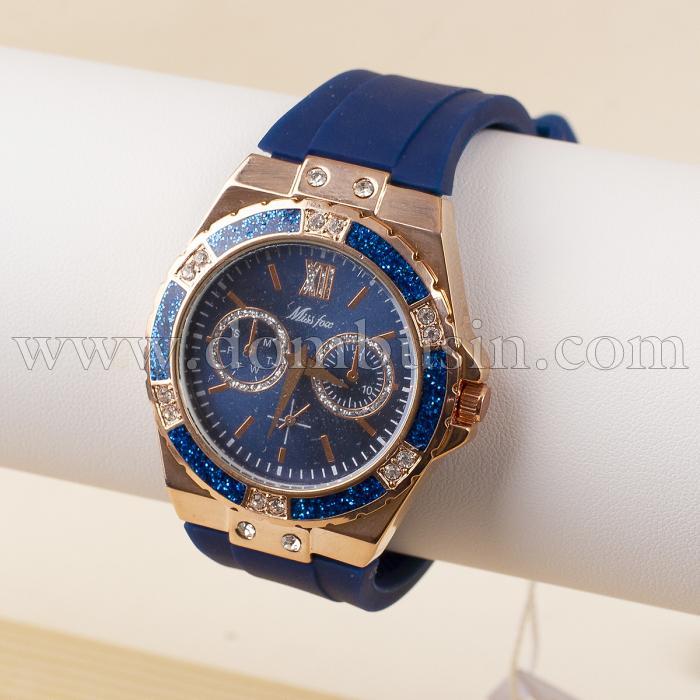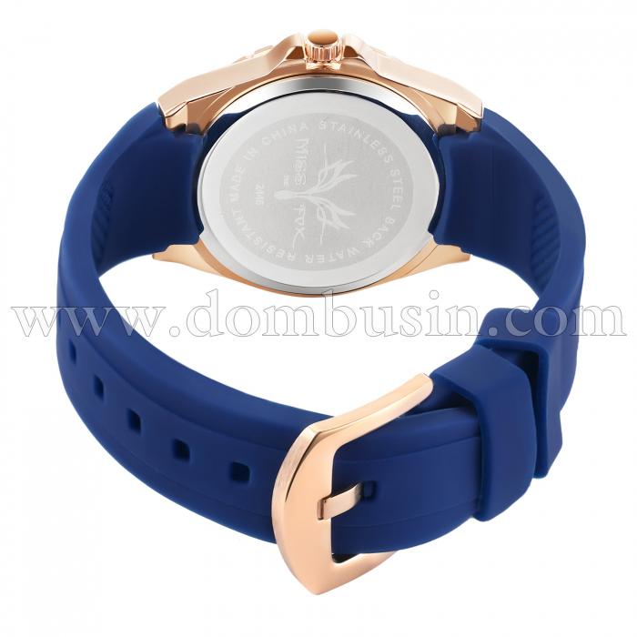Жіночий кварцовий годинник із біжутерного сплаву з силіконовим ремінцем, корпус прикрашений стразами. Задня кришка із нержавіючої сталі. Водостійкість: 30м