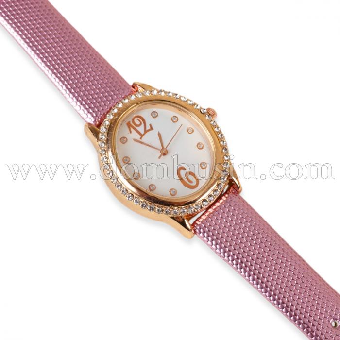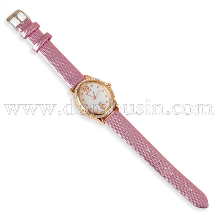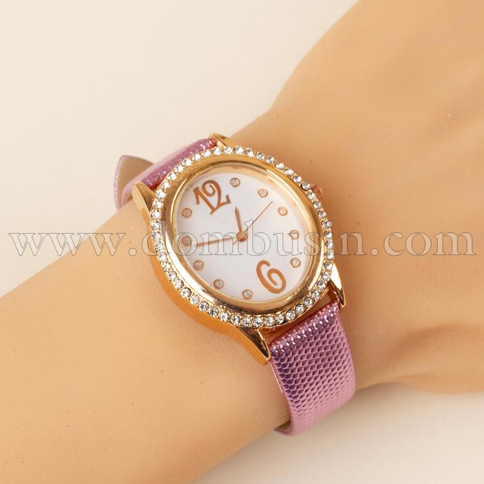 Жіночий кварцовий годинник зі сплаву зі стразами, водонепроникний, колір корпусу рожеве золото, ремінець зі шкірозамінника.